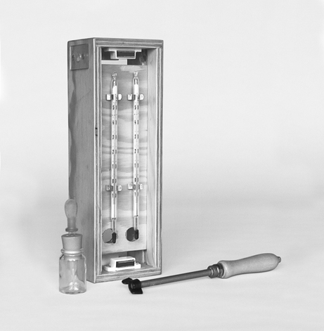 Comprend un manche, un axe autour duquel tourne un étui dans lequel sont fixés un thermomètre sec et un thermomètre humide, ainsi qu’une table de détermination de l’humidité relative.